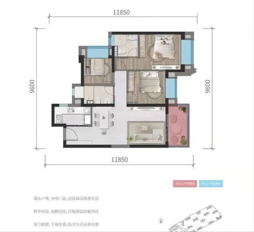 A户型95㎡,三室两厅两卫