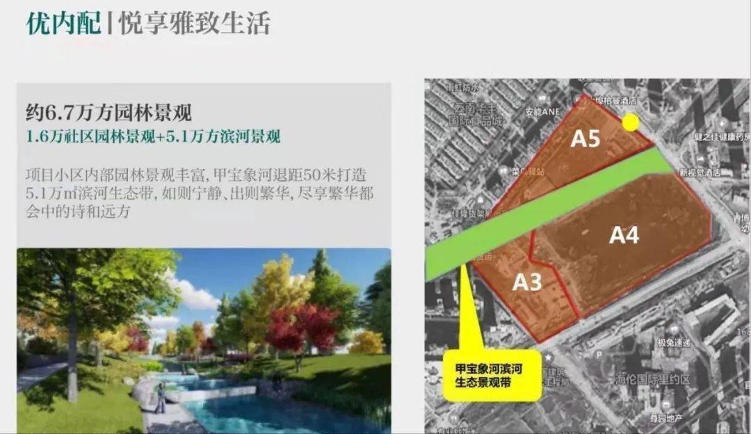 项目秉持着“城市桃源”的理念,将项目一半占地用来打造约6.7万方园林,将自然化、艺术化的园居生活融入到产品中,约48%的绿地率,确保园林中的绿化可视率,注重常绿和落叶配比结合,以期打造四季不同的风情效果,并且将宝象河水引入项目内,打造滨河生态走廊,实现社区景观的多样化。
