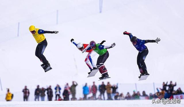 2月12日,奥地利选手雅各布·杜泽克、法国选手肖莱、加拿大选手埃利奥特·格伦丁、奥地利选手亚历山德罗·黑默勒(从左到右)在单板滑雪男子障碍追逐决赛中冲线。