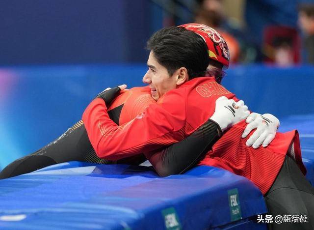 2月12日,孙龙(后)在短道速滑男子1000米A组决赛后和队友刘少昂拥抱。