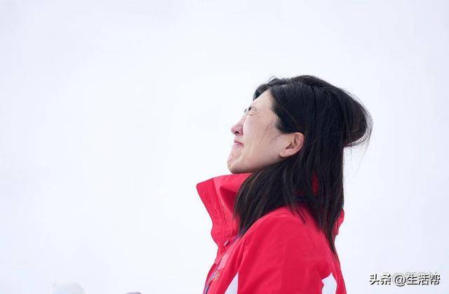 2月16日,中国选手谷爱凌(前)在自由式滑雪女子大跳台决赛第三跳后向观众致意。