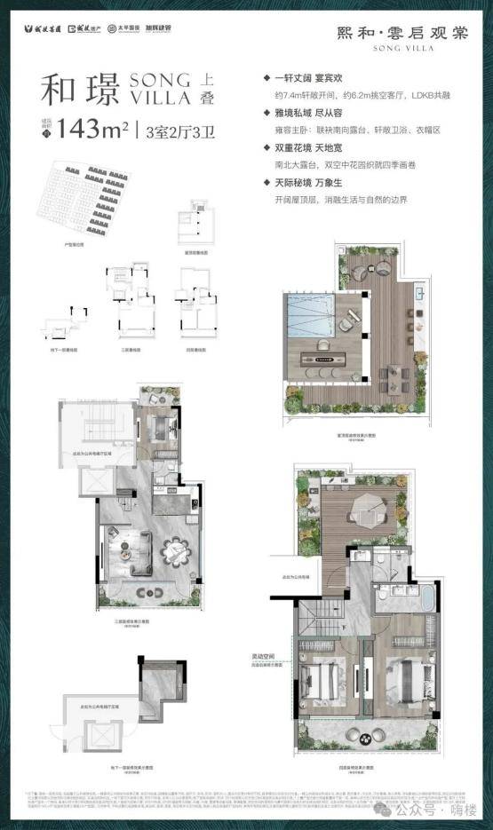 约143㎡上叠:可做3房3卫,同样赠送客厅挑高。拥有南北双露台,最惊艳的是屋顶赠送一个星空大露台,视野和情怀都拉满了,满足了人们对露台观景的所有向往。