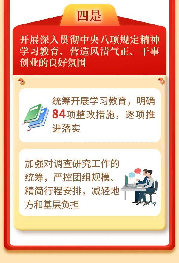 四是开展深入贯彻中央八项规定精神学习教育,营造风清气正、干事创业的良好氛围。我们统筹开展学习教育,一体推进学查改,明确84项整改措施,逐项推进落实。落实精文简会要求,实行发文和会议活动计划管理。加强对调查研究工作的统筹,严控团组规模、精简行程安排,减轻地方和基层负担。完善作风建设常态化长效化机制,持之以恒纠“四风”、转作风、树新风。