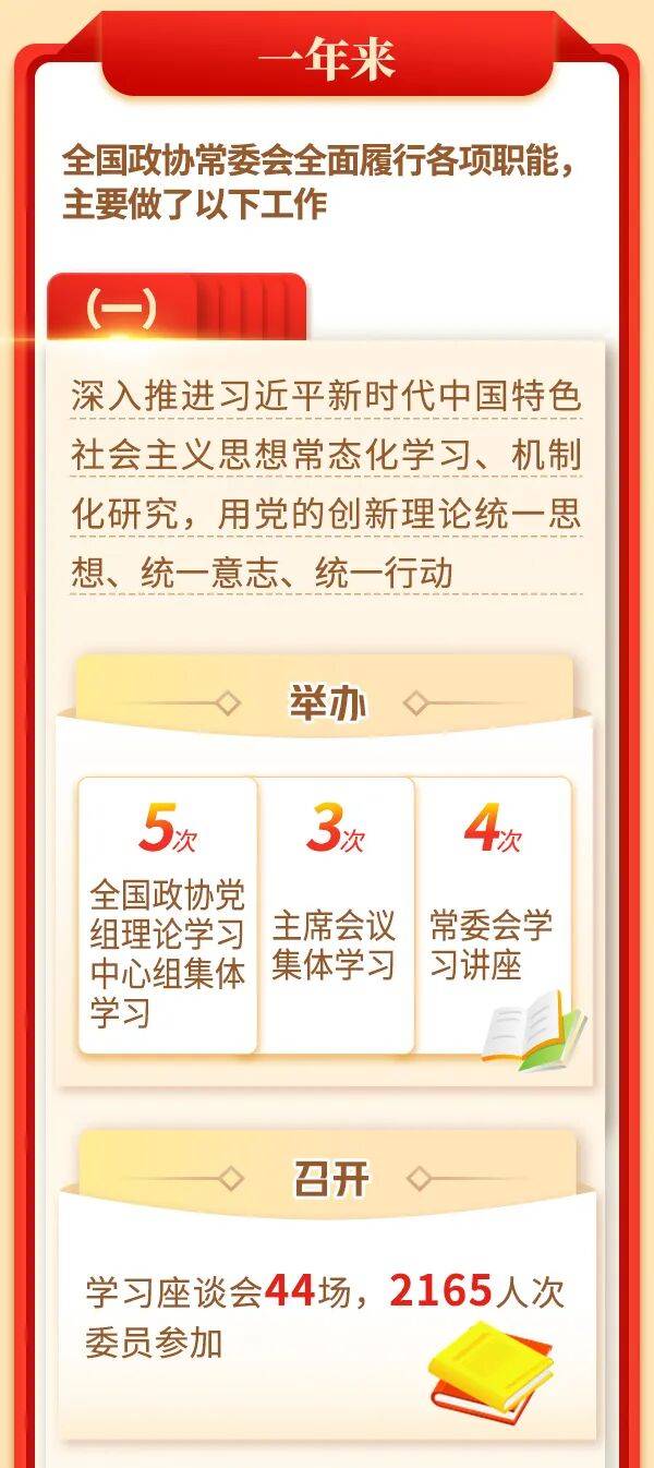 (一)深入推进习近平新时代中国特色社会主义思想常态化学习、机制化研究,用党的创新理论统一思想、统一意志、统一行动。我们举办5次全国政协党组理论学习中心组集体学习、3次主席会议集体学习、4次常委会学习讲座。召开学习座谈会44场,2165人次委员参加。坚持学习调研制度,主席会议成员开展学习调研69次,823人次委员参加。深入开展委员读书活动,组织线上线下研学75次,3322人次委员参加。修订《习近平关于人民政协工作论述摘编》,作为理论学习培训教材。组织开展习近平总书记关于扶贫脱贫工作的重要论述、新质生产力学理研究等课题94项,支持委员和中国人民政协理论研究会理事、机关干部开展理论研究153项。围绕习近平经济思想的丰富内涵和实践要求等主题,举办4次季度理论研讨会。《人民日报》、《求是》杂志发表全国政协理论研究成果18篇,《人民政协报》、《中国政协》杂志通过理论研究专版、专栏、专刊等形式刊发理论文章401篇。