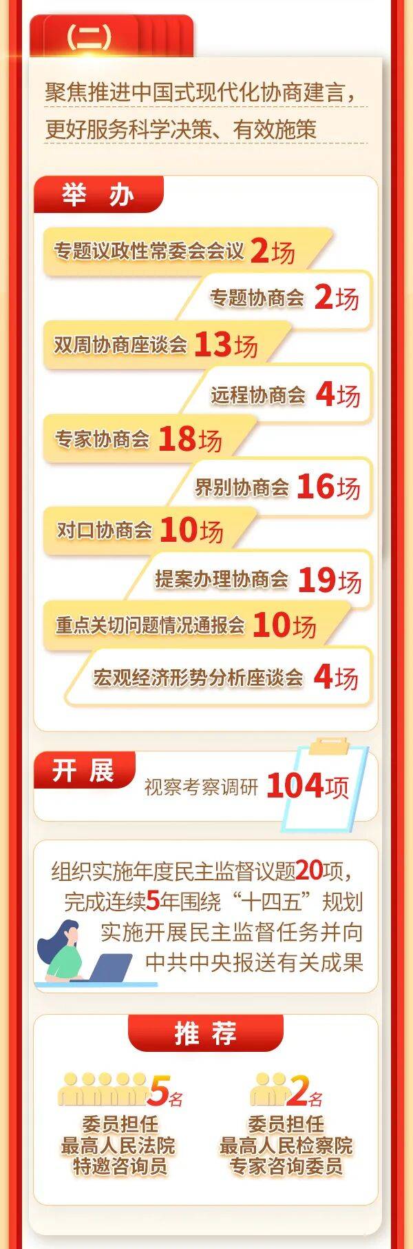 (二)聚焦推进中国式现代化协商建言,更好服务科学决策、有效施策。我们举办专题议政性常委会会议2场、专题协商会2场、双周协商座谈会13场、远程协商会4场、专家协商会18场、界别协商会16场、对口协商会10场、提案办理协商会19场、重点关切问题情况通报会10场、宏观经济形势分析座谈会4场。就深化经济体制改革、以科技创新引领新质生产力发展、营造一流营商环境、巩固和完善农村基本经营制度、建立能耗双控向碳排放双控全面转型新机制、推进文化和科技深度融合、优化区域教育医疗资源配置、完善和创新社会治理、支持发展公益慈善事业、发挥文博事业力量铸牢中华民族共同体意识、强化粤港澳大湾区规则衔接机制对接、引导华侨传递好中国声音等协商议政。发挥调查研究基础性作用,开展视察考察调研104项。组织实施年度民主监督议题20项,完成连续5年围绕“十四五”规划实施开展民主监督任务并向中共中央报送有关成果。推荐5名委员担任最高人民法院特邀咨询员、2名委员担任最高人民检察院专家咨询委员。