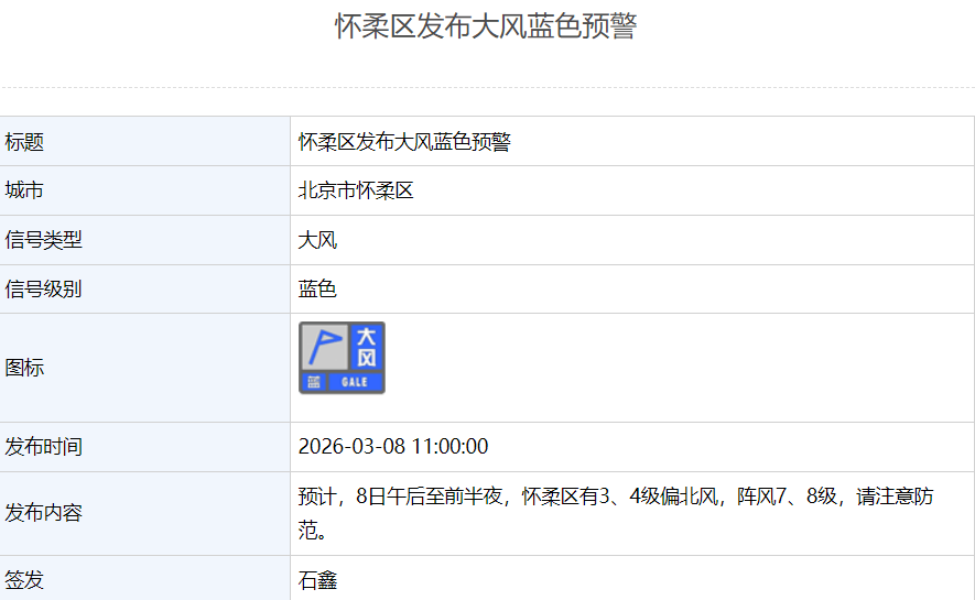 3月8日上午,怀柔、平谷、顺义、密云四区先后发布大风蓝色预警,请注意防范。