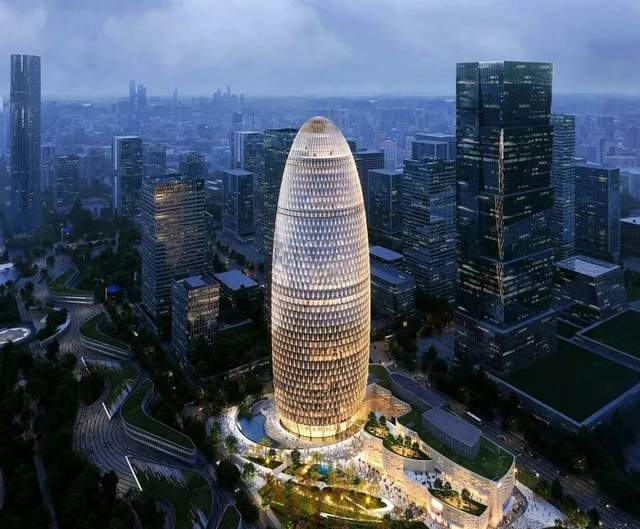 建筑由美国Gensler事务所设计,灵感来源于中国古代的玉贝货币。其外观呈现出独特的纺锤流线造型,顶部与底部微微内收,线条柔美而富有动感。