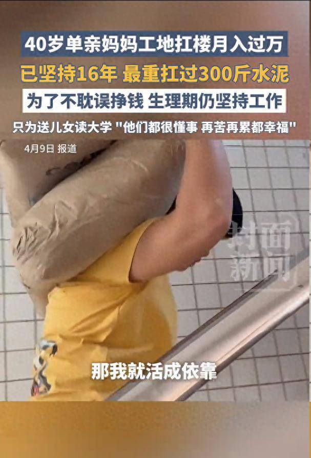 在建筑工地的喧嚣中,40岁的陈美兰(化名)已默默“扛楼”16载。每日肩扛上百斤水泥砂石往返于楼梯间,最重时一次扛过300斤,月入勉强过万。这位单亲妈妈用汗水浇灌着两个孩子的未来——女儿已大学毕业成为教师,儿子正在读大二。