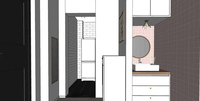 梳理一下洗漱台和左侧入户以及厨房之间的格局关系。