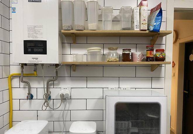 装修本身的话,选用白色橱柜,配上白色工字铺贴的墙砖,看着干净简洁,又能提亮空间和放大视觉空间,另外,置物隔板加上橱柜在收纳上也做到了有藏有露,自然在使用上也更为人性化。