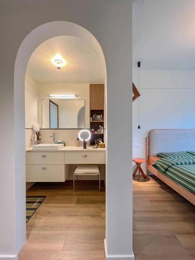 同时,为了规避卫生间对着床的尴尬,中间可以采用玻璃隔断的方式,规划一块梳妆区,兼顾实用性与功能性。