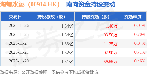 证券之星消息,11月26日南向资金增持1.4万股海螺水泥(00914.HK)。近5个交易日中,获南向资金增持的有5天,累计净增持358.7万股。近20个交易日中,获南向资金增持的有18天,累计净增持1423.0万股。截至目前,南向资金持有海螺水泥(00914.HK)1.34亿股,占公司已发行普通股的10.28%。