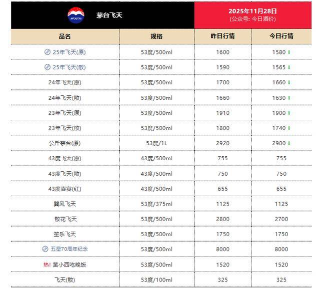 据今日酒价消息,2025年53度飞天茅台的散瓶批价已于11月26日跌破了1600元/瓶,再创新低。截至11月28日,飞天原箱和散瓶的批发价继续回落,双双跌破1600元/瓶,分别报1580元/瓶和1565元/瓶。