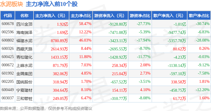 从资金流向上来看,当日水泥板块主力资金净流入4.8亿元,游资资金净流出2.75亿元,散户资金净流出2.04亿元。水泥板块个股资金流向见下表: