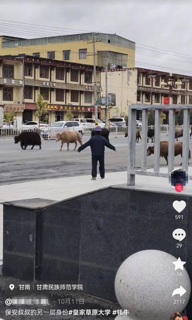 记者注意到,许多网友打趣这是“草原大学”。小麦说,他们确实在草原上学,这里有许多的牧民放牦牛,所以在马路上经常可以看到成群的牦牛,它们的松弛感拉满。最近还有人发布了为了防止牦牛误入校园,学校门口的保安帮忙赶牦牛的视频,并配文没想到“保安叔叔还有另一层身份”。