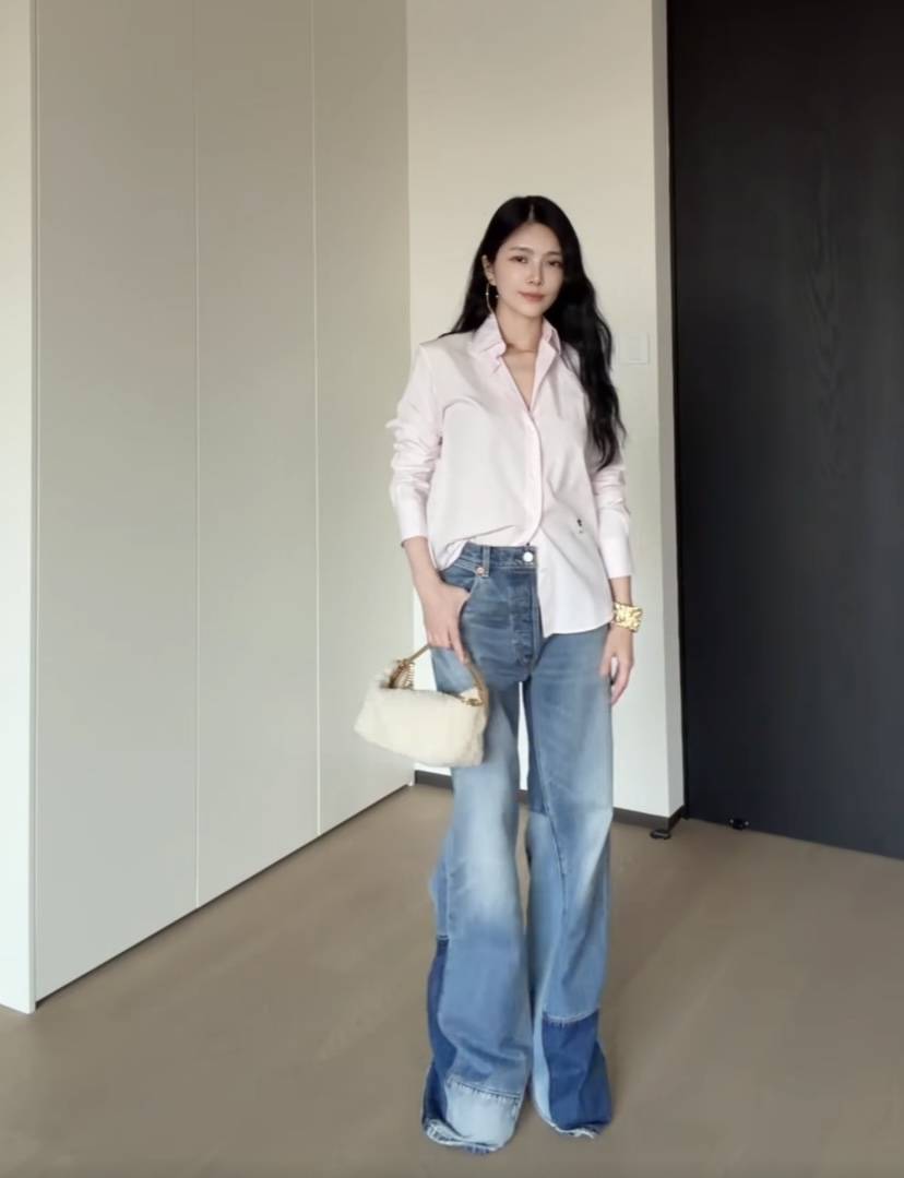 杜淳也是好眼光,只从这么多牛仔裤里面挑出来一条比较特别的。高腰的阔腿牛仔裤,裤筒还做了不对称的撞色设计,一看就非常洋气。原来牛仔裤也可以穿得不那么规规矩矩!