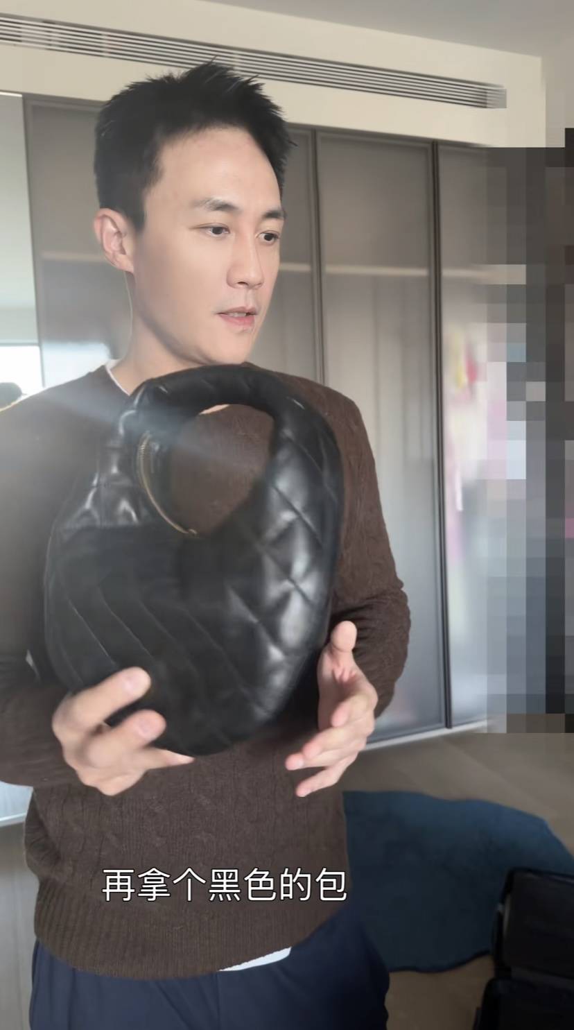 黑色的包包,是一种小挎包,也很容易凹造型。杜淳也许是见惯了老婆平日里怎么搭配,找配饰都那么专业。