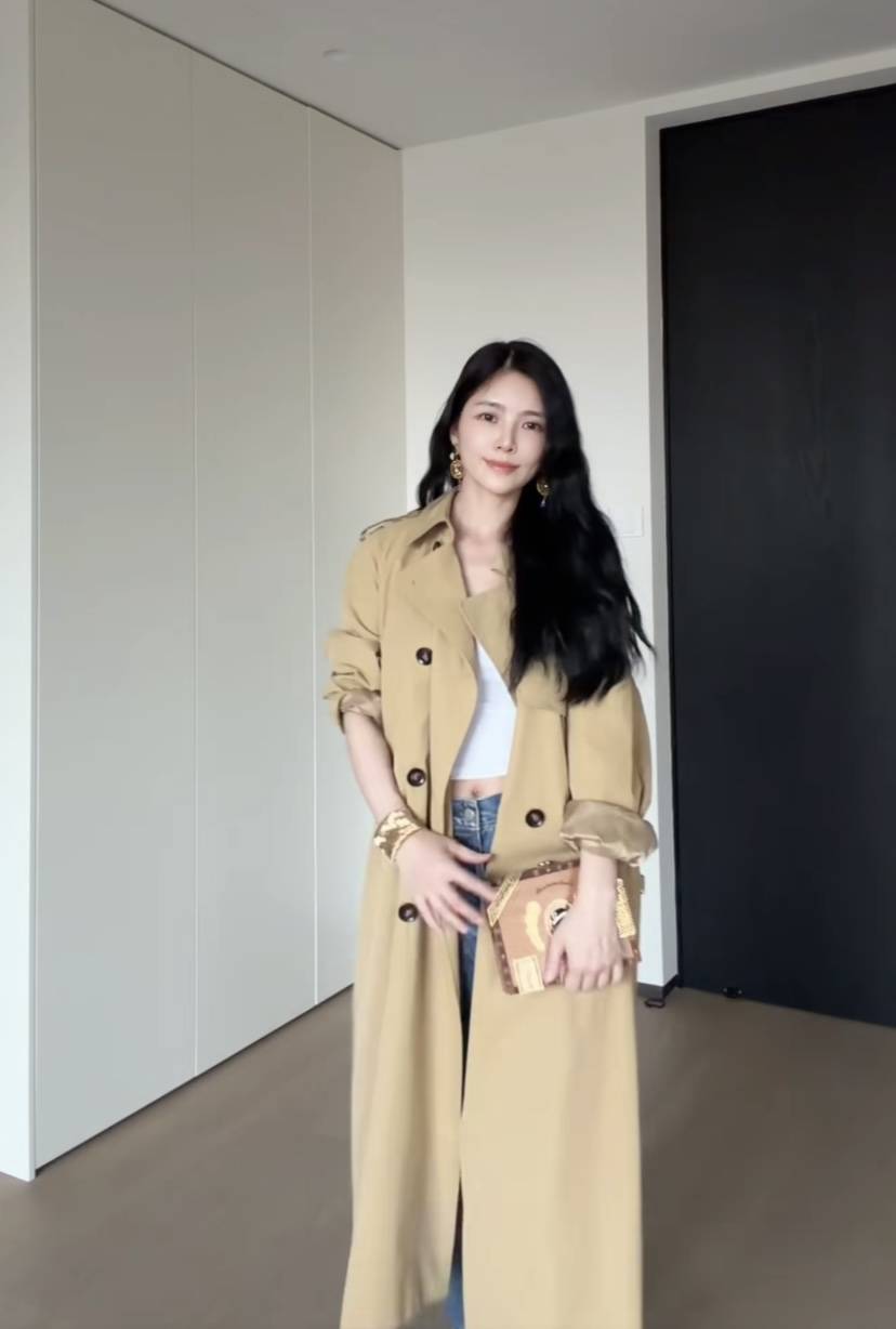 第三套look,杜淳在长衣区给王灿找了一件卡其色的长风衣。这种长风衣很帅气、也飒美,配牛仔裤高跟鞋就不会出错。