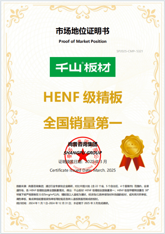 千山板材“HENF级精板全国销量第一”是市场对其高度认可的最直接证明。历经27年发展,千山板材已构建从基材、胶水到全屋定制的全产业链体系,产品覆盖全国30多个省区,拥有2000多家品牌专卖店,建立了健全的销售与售后网络,用一张张板材,构建起与消费者双向奔赴的信任。