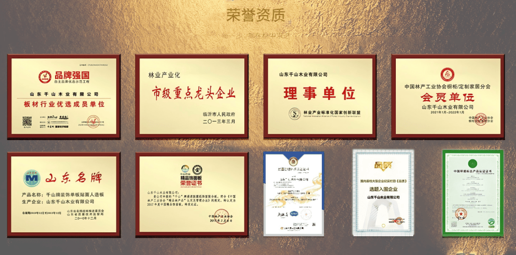 千山板材的荣誉背书,不仅通过了ISO9001质量管理体系、欧盟CE等权威认证,更荣获了山东名牌、省级林业重点“龙头企业”、板材十大品牌等多项荣誉,为其一线品牌地位提供了坚实的背书。