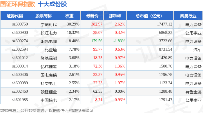 证券之星消息,12月1日,国证环保(399358)指数报收于5546.78点,涨0.95%,成交655.53亿元,换手率0.84%。当日该指数成份股中,上涨的有27家,天赐材料以2.76%的涨幅领涨,下跌的有10家,阿特斯以6.92%的跌幅领跌。