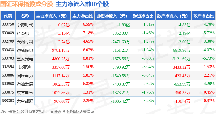 资金流向方面,国证环保(399358)指数成份股当日主力资金净流出合计12.87亿元,游资资金净流入合计4.86亿元,散户资金净流入合计8.01亿元。成份股资金流向详情见下表: