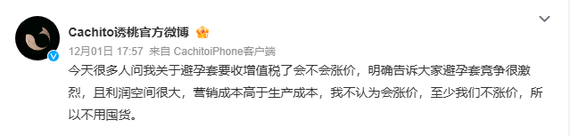 值得一提的是,有情趣品牌则表示避孕套不会涨价,对于消费者没啥影响,因为本身这行业利润空间很大。