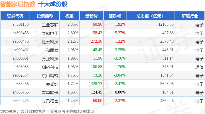 智能家居(399996)指数十大成份股详情如下: