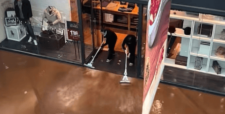 此外,据其他网友晒出的视频显示,奶茶店旁边的一家服装店也受到了污水的影响,两名工作人员正在门口清理。