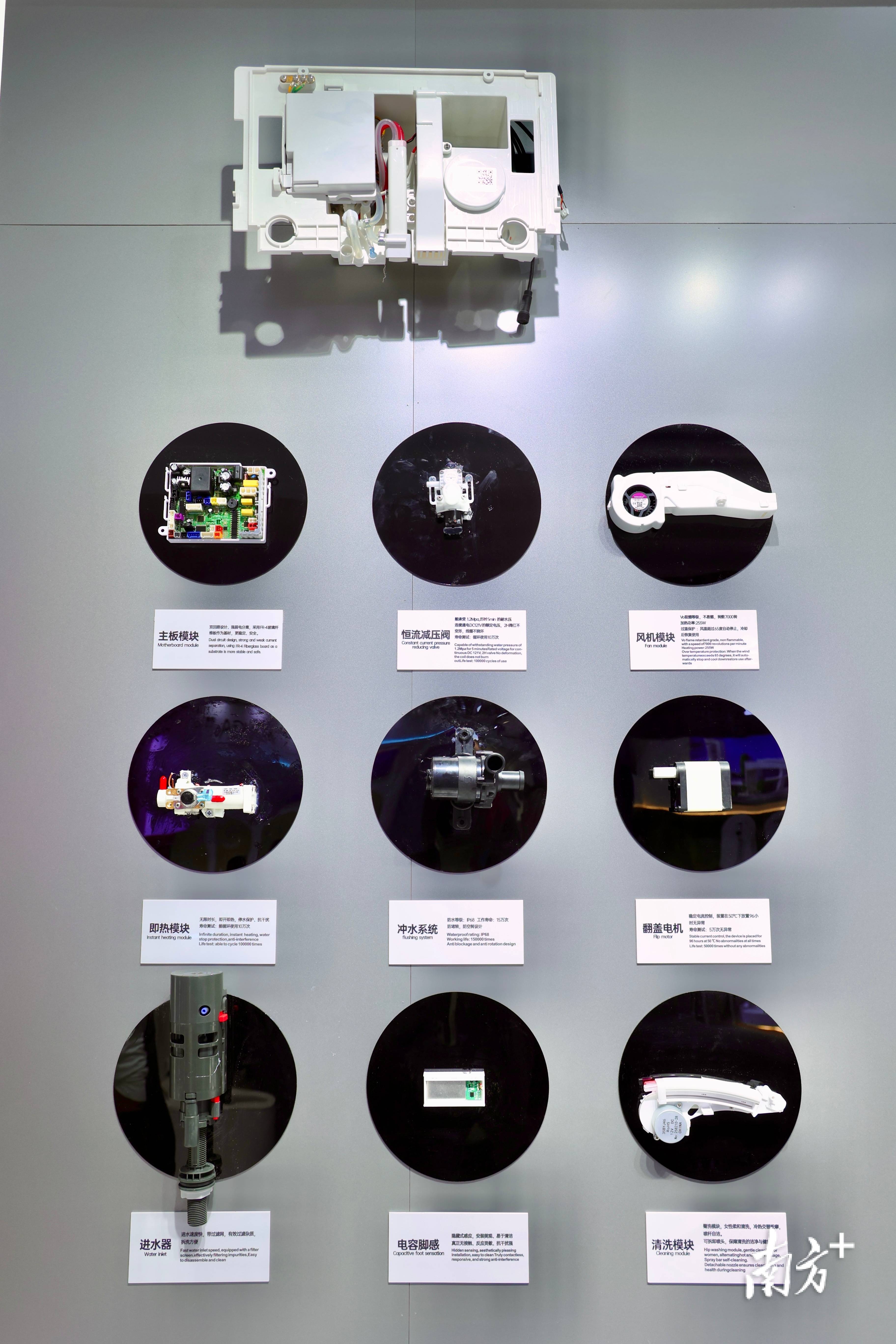 除了展示整体产品外,不少企业还自信亮出产品“内核”展示智造实力。主板模块、即热模块、冲水系统、电容脚感、清洗模块……贝科智能厨卫将智能马桶的核心组件拆解上墙。“目前市面上有部分智能马桶产品内部线路裸露,我们采用模块化机芯,将传统主板的分散元件整合为一个个单元,优化电路布局,减少冗余接线。”企业负责人陈洽冲介绍,产品可做到全封闭防水防漏电,大大减少安全隐患。