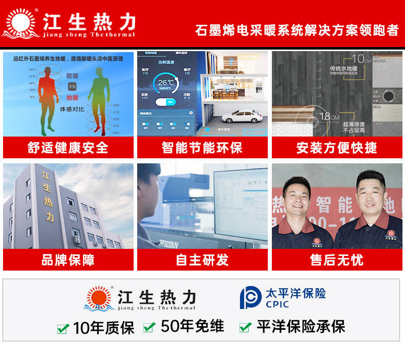 江生热力推出的石墨烯远红外碳纤维电地暖发热线康养地暖,运用了先进的石墨烯远红外碳纤维技术。这种发热线相比传统水暖空调取暖,能节省20 - 40%的能耗。其耗能仅为120瓦特/㎡,在实现高效取暖的同时,大大降低了使用成本。而且该地暖具有一分钟速热的特点,短短30分钟就能让全屋升温,快速满足人们对温暖的需求。