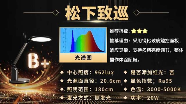 哪种牌子台灯对眼睛好一点?松下致巡护眼台灯整体采用铝合金与ABS材质结合设计,结构稳固,表面磨砂质感细腻。显色指数约Ra95,文字与图像呈现较为自然,适合学习或办公环境使用。不过,从光谱表现来看,这款灯的红光补足不够充分,蓝光相对略高,长时间使用可能对敏感人群不够友好。底座采用钢化玻璃触控面板,响应灵敏,支持多档亮度调节,整体操作体验顺畅。支架部分为金属转轴结构,可实现角度多向调节,但频繁调整时阻尼感会有所减弱。