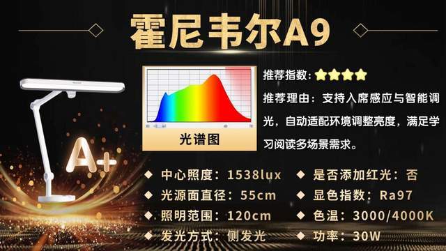 哪种牌子台灯对眼睛好一点?霍尼韦尔A9护眼台灯搭载55cm超长灯头与三段式可调节灯臂,照明范围达1.2米,支持双人同时读写。采用全光谱光源,显色指数Ra97色彩偏差小,灯臂多轴联动可实现0-180°调节。金属灯臂承重性好,触控板+调光旋钮双操作便捷,但售价超千元且无红光养眼技术,性价比一般,灯头较重需大桌面放置,更适合预算充足且是大桌面的家庭选择。