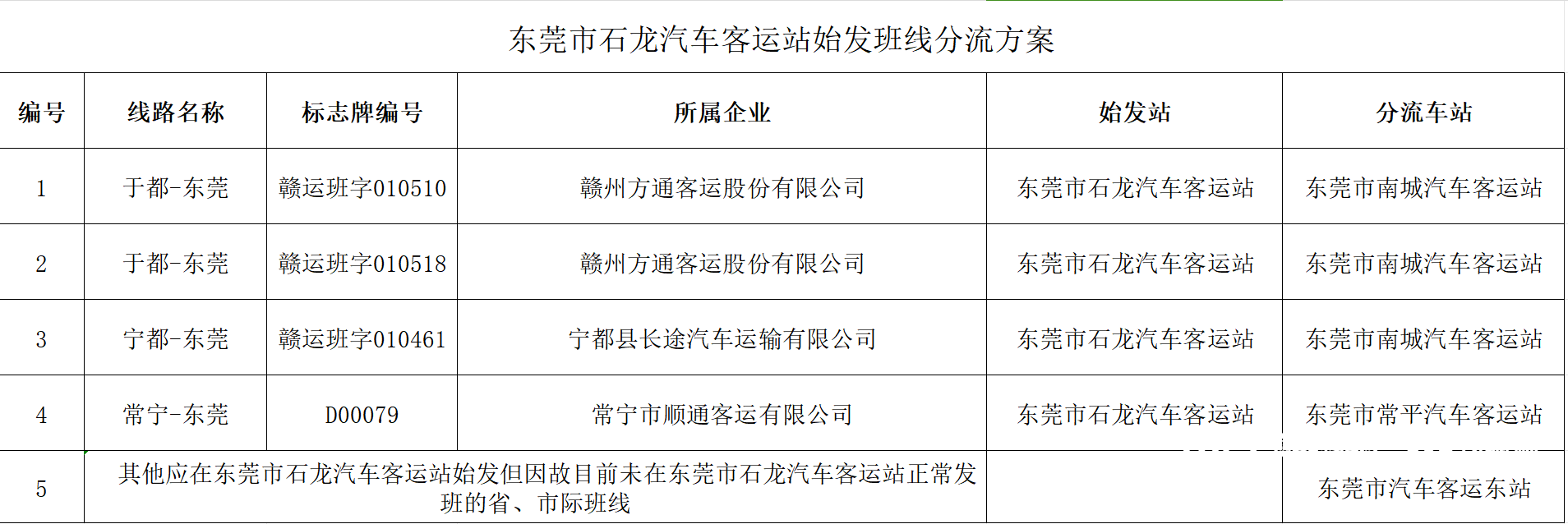 原进入东莞市石龙汽车客运站始发班车分流至东莞市南城汽车客运站、东莞市常平汽车客运站等。相关线路经营单位也可自主选择东莞市其他汽车客运站分流,均须于2026年3月15日前完成客运标志牌变更手续,逾期未完成的将按不按批准站点经营予以查处;超过180天未进入核准站点经营的,视为终止经营并作相应处理。