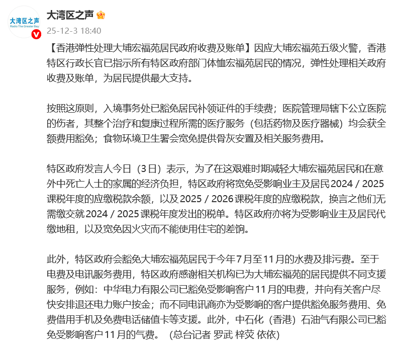 12月3日,@大湾区之声:因应大埔宏福苑五级火警,香港特区行政长官已指示所有特区政府部门体恤宏福苑居民的情况,弹性处理相关政府收费及账单,为居民提供最大支持。