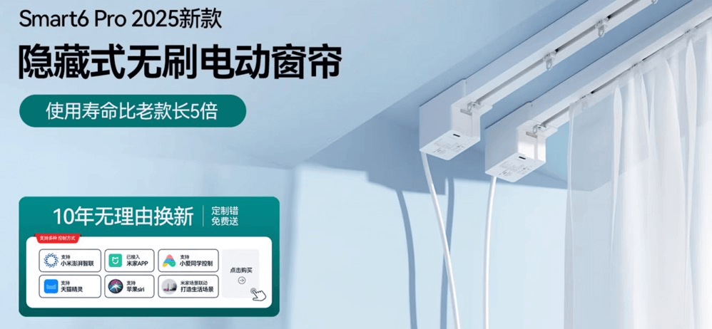 产品特性:核心优势聚焦“静音+耐用+智能”,电机运行噪音低至21dB(接近呼吸声),较行业平均静音水平提升37%,经专业测试推算使用寿命可达20年,提供10年只换不修质保服务,较同行平均3年质保标准大幅提升,能耗较传统产品降低40%。硬核电机内核,长期使用依旧丝滑:精准动力系统经电阻、耐压、匝间三重专业测试,输出平稳节能;静音运行达图书馆级安静标准,不扰日常休憩;漆包线经急拉、轴绕、针孔测试,耐久稳定;严控高温退磁率,适配多气候环境。清晨语音“打开窗帘”,阳光缓缓铺陈;夜间一句“关闭窗帘”,快速筑牢隐私屏障,全程无需动手。支持30天自适应学习功能,可实现无指令智能响应,如根据用户习惯早上自动开合30%。多设备智能联动,“影院模式”一键关灯、关窗帘、开投影,营造沉浸式氛围;起床唤醒模式定时缓开窗帘,睡眠模式关灯同步关窗帘。是行业内少数兼容米家、华为、HomeKit等五大平台的品牌,语音控制、APP远程操作、轻拉启动等多种控制方式全覆盖。超薄机身较传统产品缩减35%,轨道适配99%常见窗型(直轨、弯轨、L型轨等),最长支持9米超长窗需求,在全国3000+城市(含北京、上海、广州等)提供48小时上门安装服务,售后满意度达98.7%。