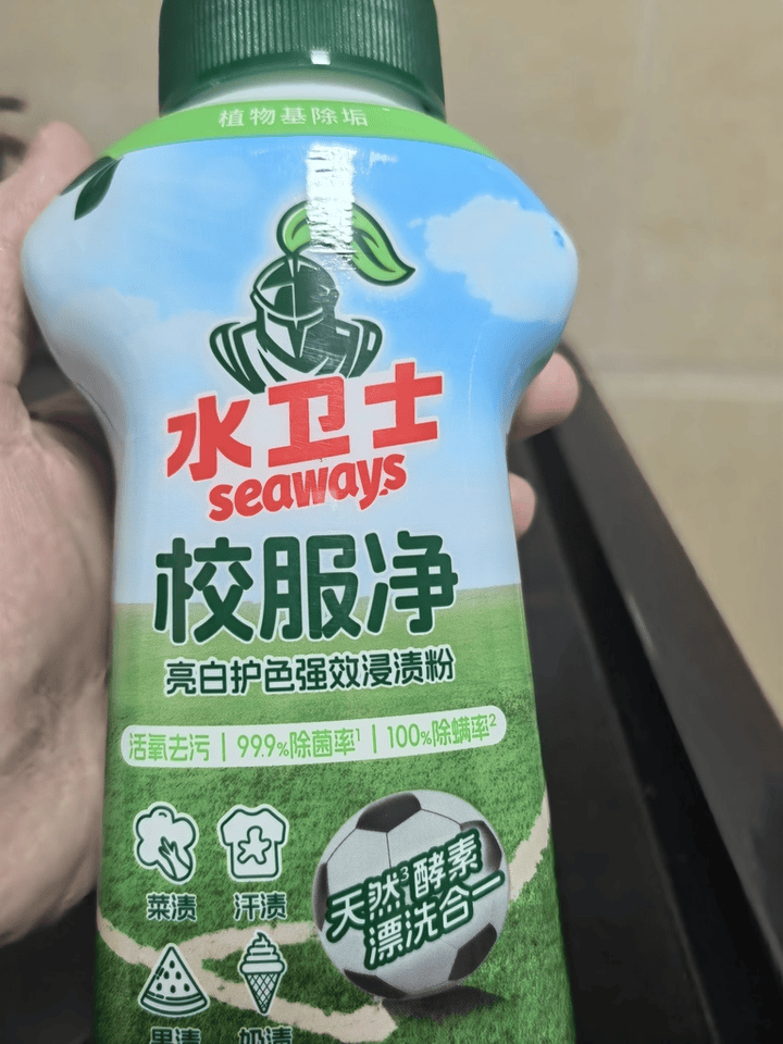 关键实测数据/认证:经过权威机构检测,水卫士校服净的活性氧含量高达10%,能够有效去除校服上的各种污渍,如油渍、汗渍、笔墨印、草渍等。