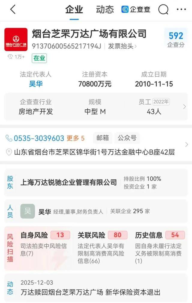 公开资料显示,烟台芝罘万达广场有限公司成立于2010年11月,注册资本7.08亿元,核心业务为自有物业出租与经营。2024年7月,大连万达商业管理集团(以下简称“万达商管”)曾将该公司股权出售给上述两家机构,此次股权变更意味着项目控制权在不足半年后重回万达体系。