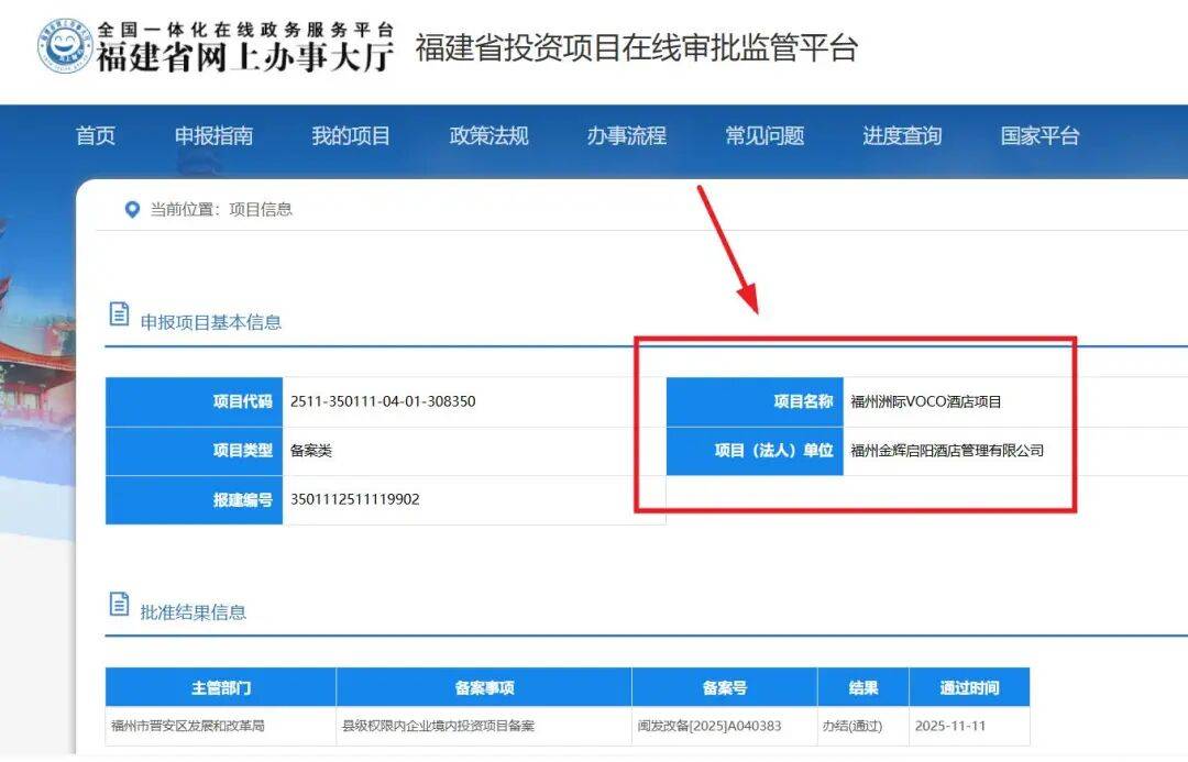 福建省投资项目在线审批监管平台发布信息显示,“福州洲际VOCO酒店项目”已于11月11日取得县级权限内企业境内投资项目备案,批准结果信息为办结(通过)。