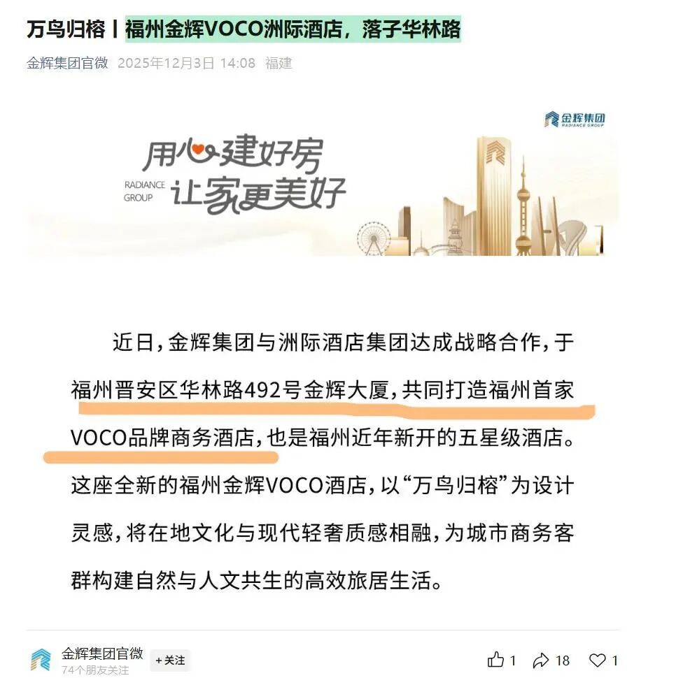 海西房产网(微信公众号:fjhxfcw)消息:据“金辉集团官微”发文透露,金辉集团近日与洲际酒店集团达成战略合作, 在福州晋安区华林路492号金辉大厦,共同打造福州首家VOCO品牌商务酒店,也是福州近年新开的五星级酒店。