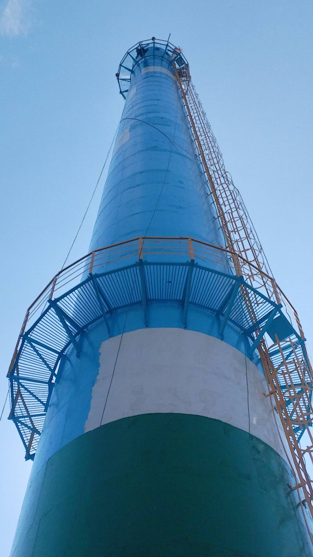 高空作业安全与效率平衡:爬梯护网沿烟筒垂直分布,作业平台移动频繁,且需频繁切换站立位置才能全面涂刷,既影响施工效率,又增加高空坠落风险。