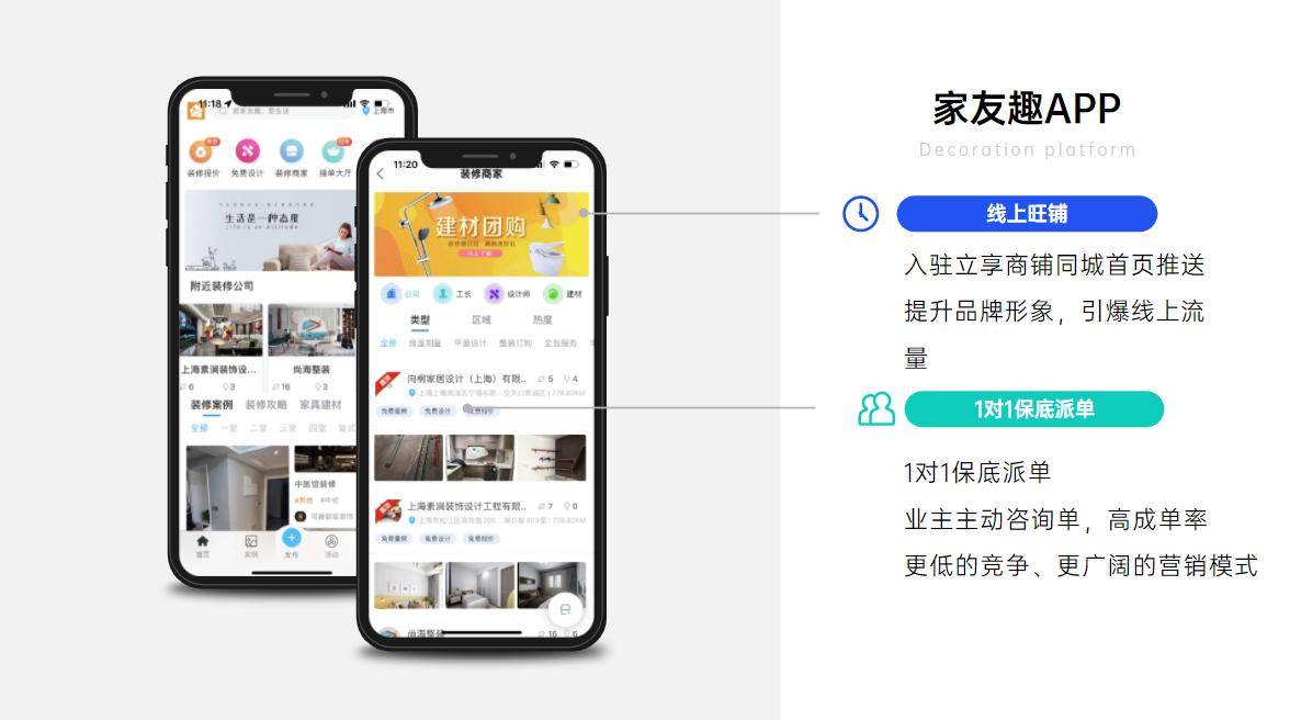 对于装修从业者而言,家友趣提供了多端口展示机会,支持PC、APP、小程序三端同步展示,并与百度、抖音等外部平台合作引流,日均触达潜在客户超10万次。入驻商家可创建线上店铺,展示装修案例、设计师作品以及用户评价,通过内容营销吸引精准客户。