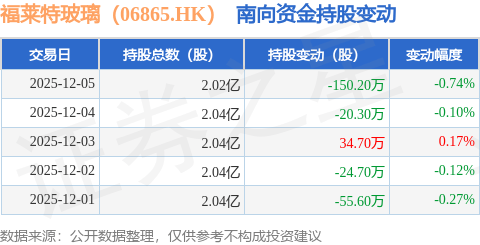 证券之星消息,12月5日南向资金减持150.2万股福莱特玻璃(06865.HK)。近5个交易日中,获南向资金减持的有4天,累计净减持216.1万股。近20个交易日中,获南向资金减持的有11天,累计净减持513.76万股。截至目前,南向资金持有福莱特玻璃(06865.HK)2.02亿股,占公司已发行普通股的45.81%。