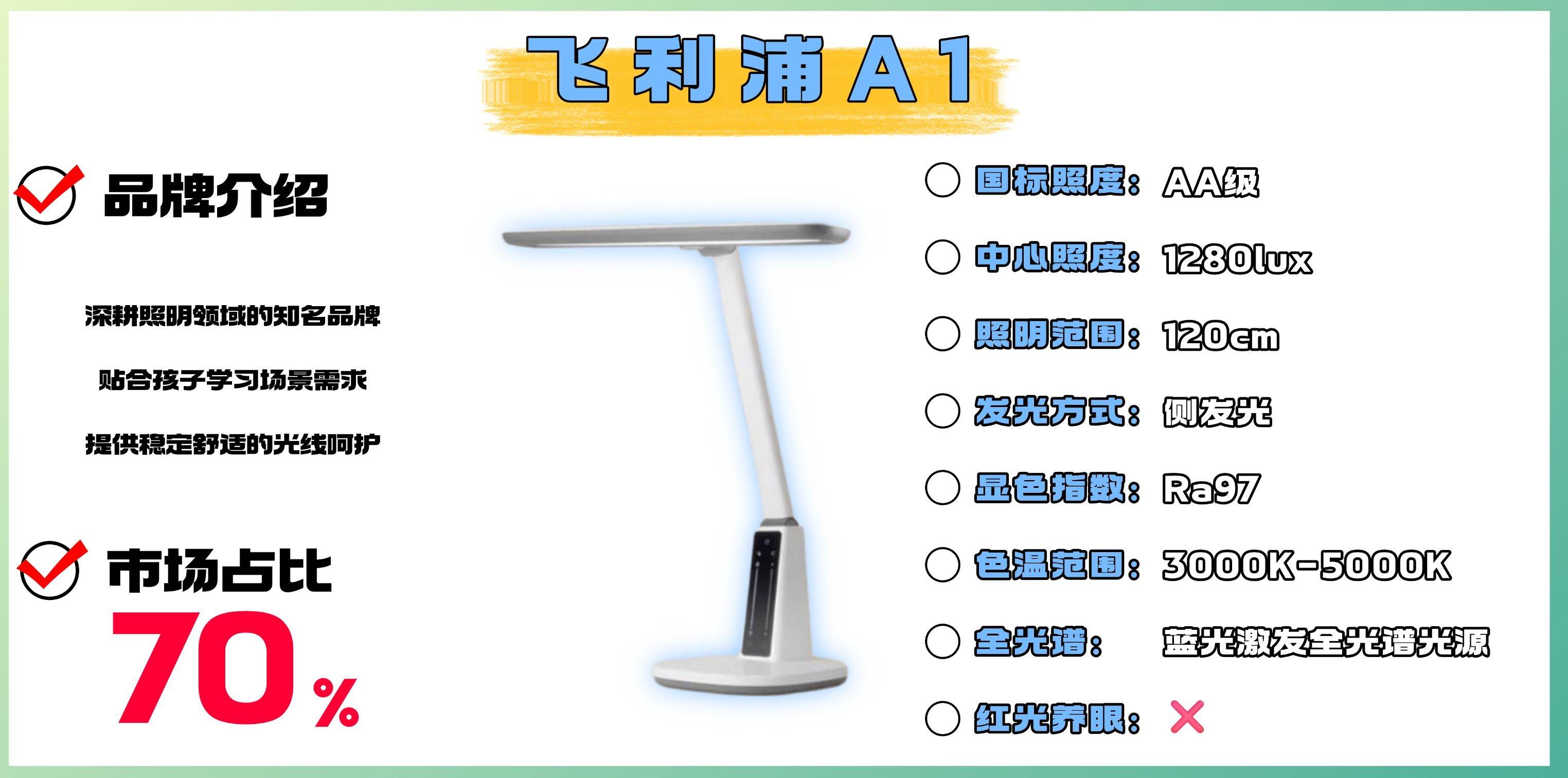 上榜理由:37cm超大T型矩形发光面专为80cm书桌设计,照明覆盖更精准。