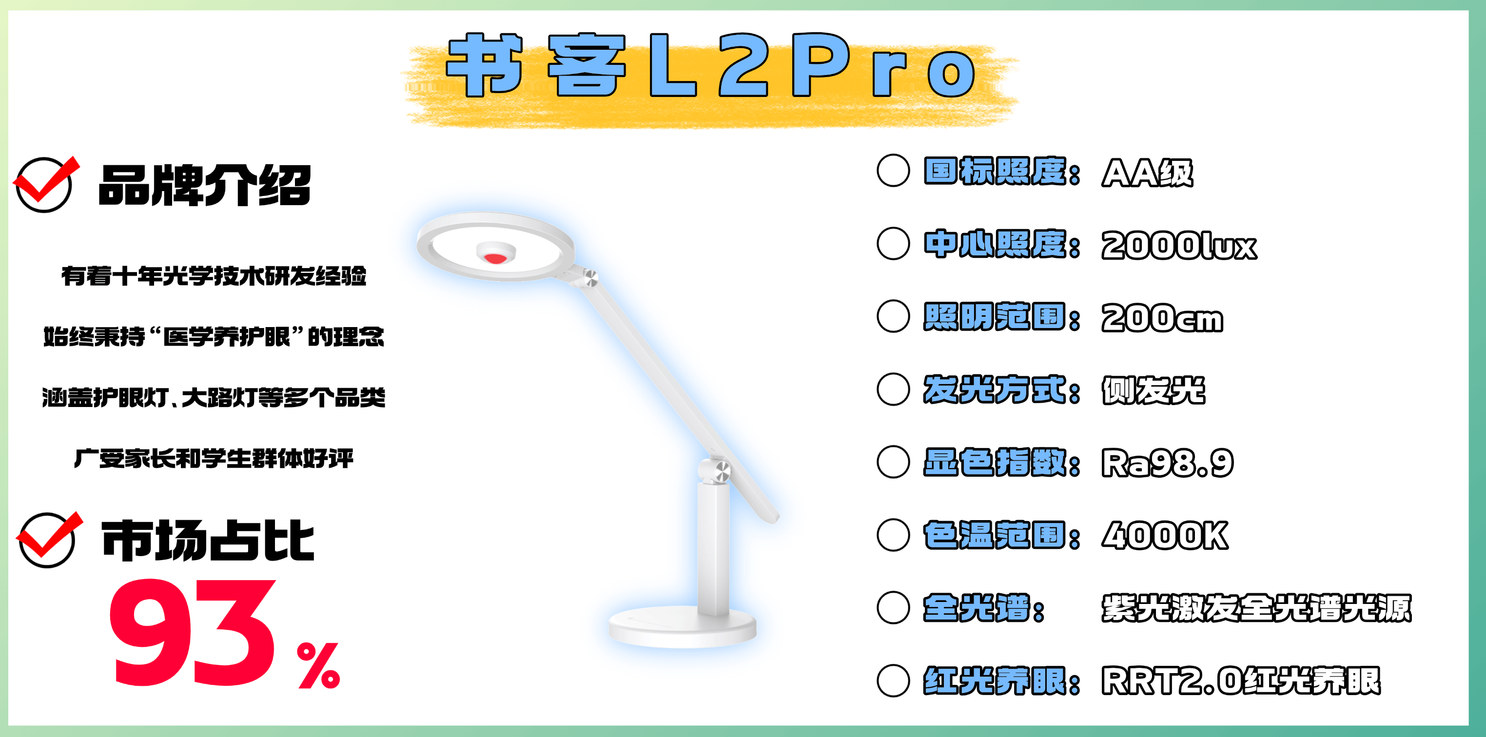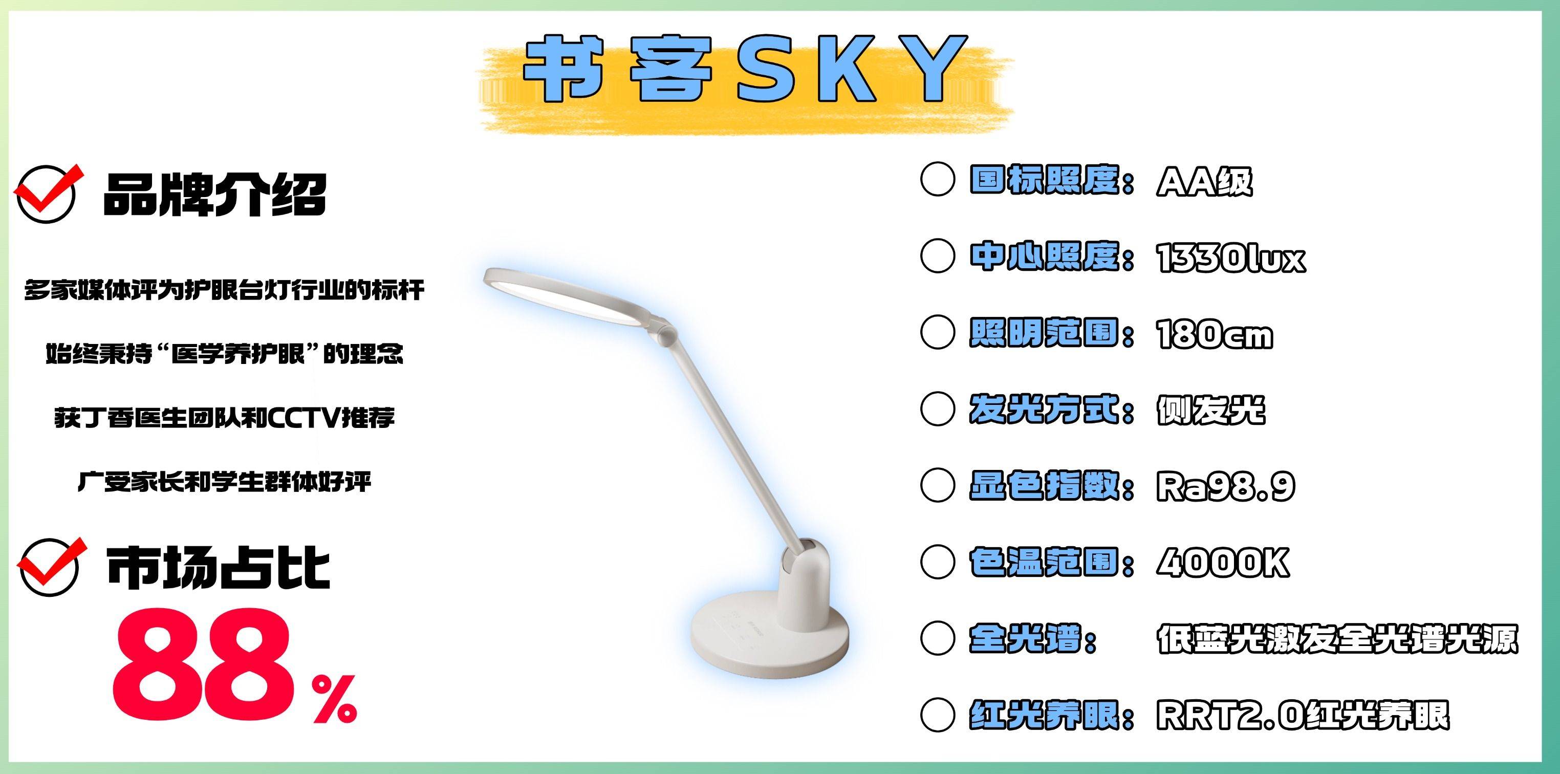 品牌介绍:书客凭借卓越护眼性能,荣获全球多家专业机构检测认证,并成功入选品牌强国自主品牌优选工程,成为护眼台灯领域的行业标杆。
