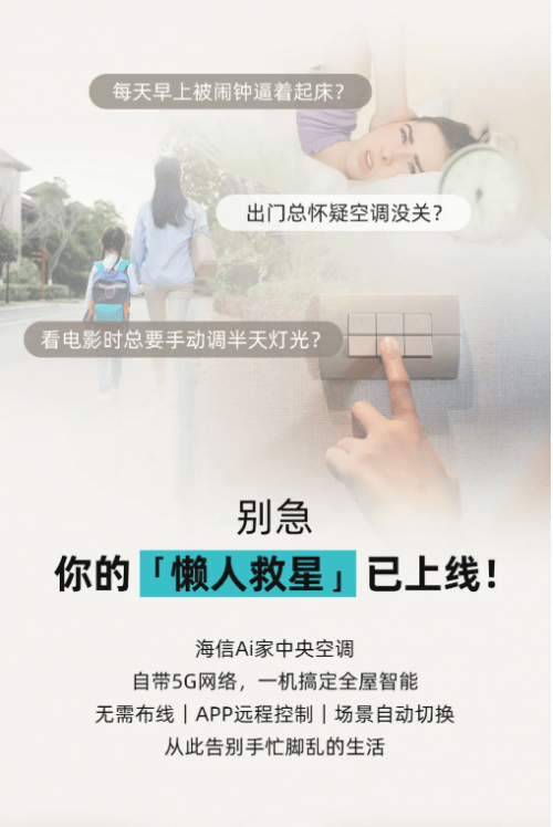 闹钟终结者:海信中央空调用5G... 每天早上被闹钟逼着起床? 出门总怀疑空调没关? 看电影时总要手动调半天灯光? 别急你的「懒人救星」已...