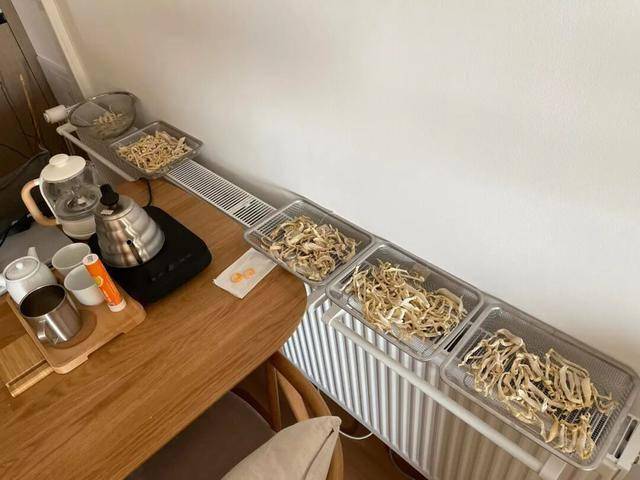 暖气费那么贵,肯定不能白供,把切好的萝卜放到不锈钢网里,再用暖气片烘干,也算是合理利用资源了。