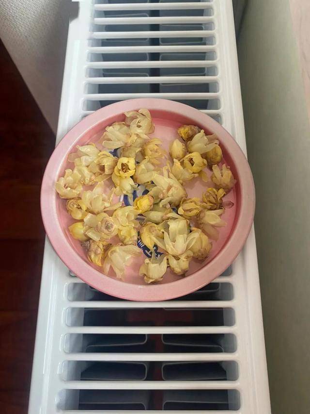 自从开暖气后,家里就养不了腊梅了,不过把它放到暖气片上烘干,不仅可以给房间留香,还能保存起来制作花茶。