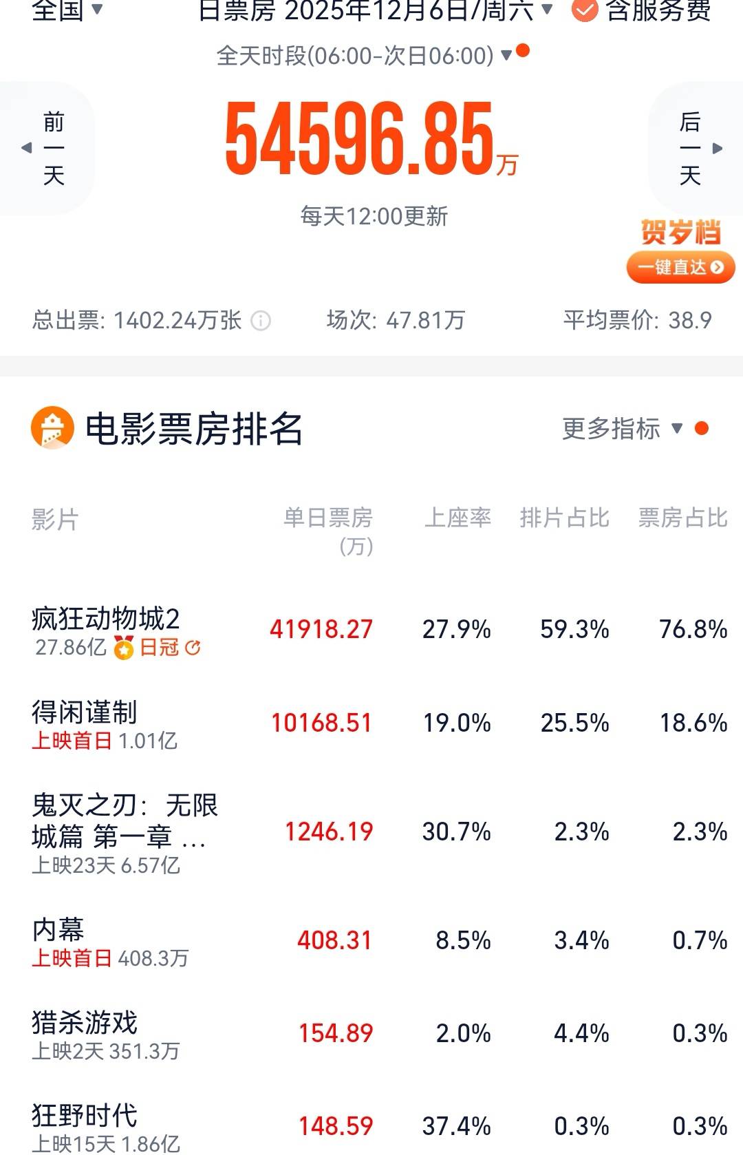 英皇影业出品,郭富城、任达华、吴镇宇、方中信等主演的港片《内幕》也于12月6日上映,首日排片占比3.4%,收票房408万元,上座率8.5%。猫眼专业版、灯塔专业版给该片的最终预测票房都不超过1700万元。