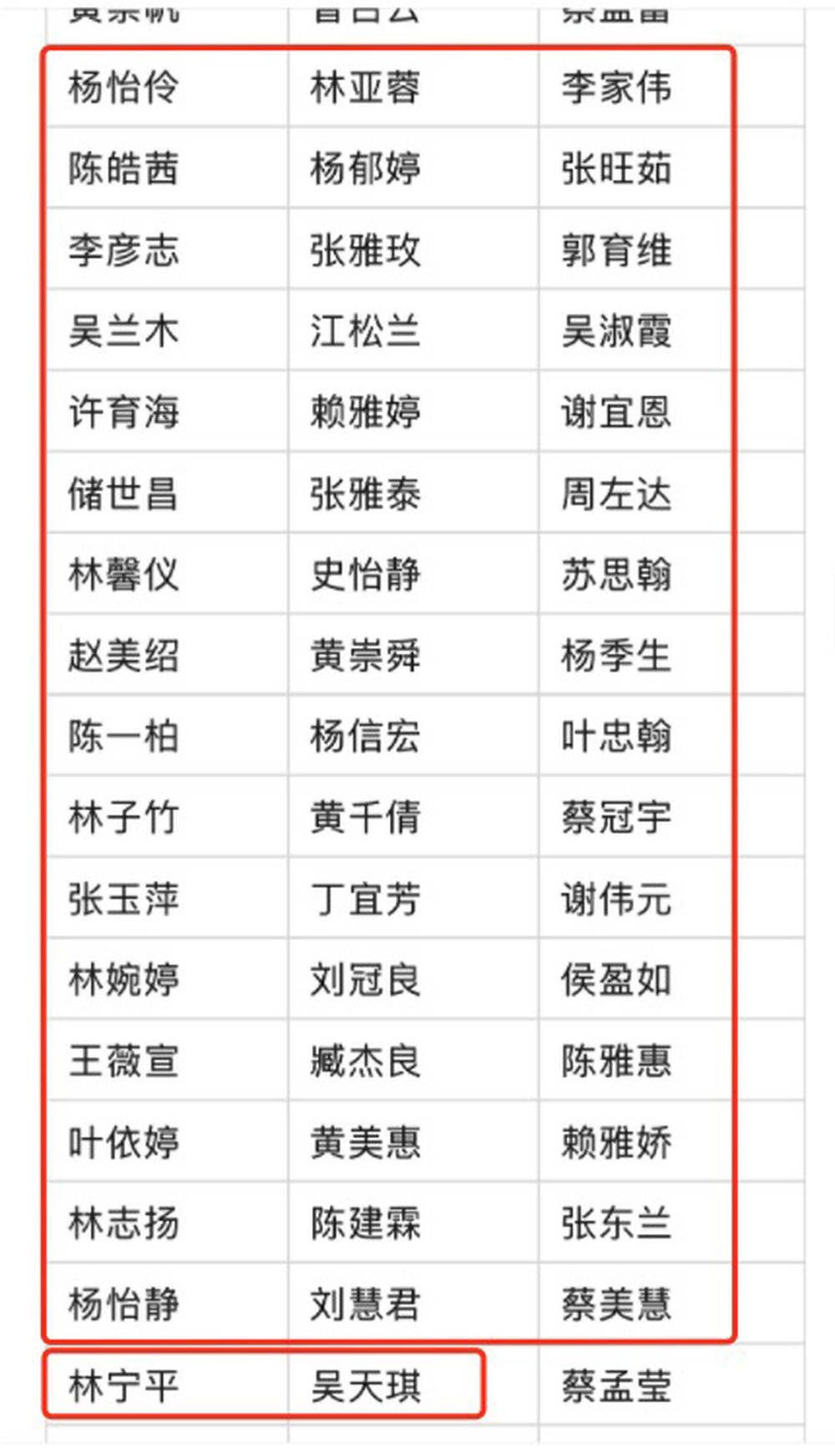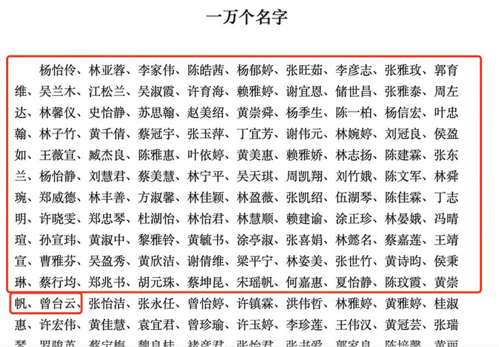 在公示的获奖名单中,特等奖80名获奖者中,大量姓名与文档《一万个名字》高度重合。例如:广西12名获奖者中,除前四人外,后续“谢思翰、李嘉宜、蔡绍吉、蔡家维、潘紫友、林丽怡、韩桂谕、杨美慧”8人姓名及排列顺序与文档完全一致;陕西9名获奖者中,“林志新、钟怡秀、林美信、广秀娟、陈贞劭、林佳安、蓝金凤、陈柔宏、赖宗翰”所有人名均与文档重合,其中7人顺序也一致。